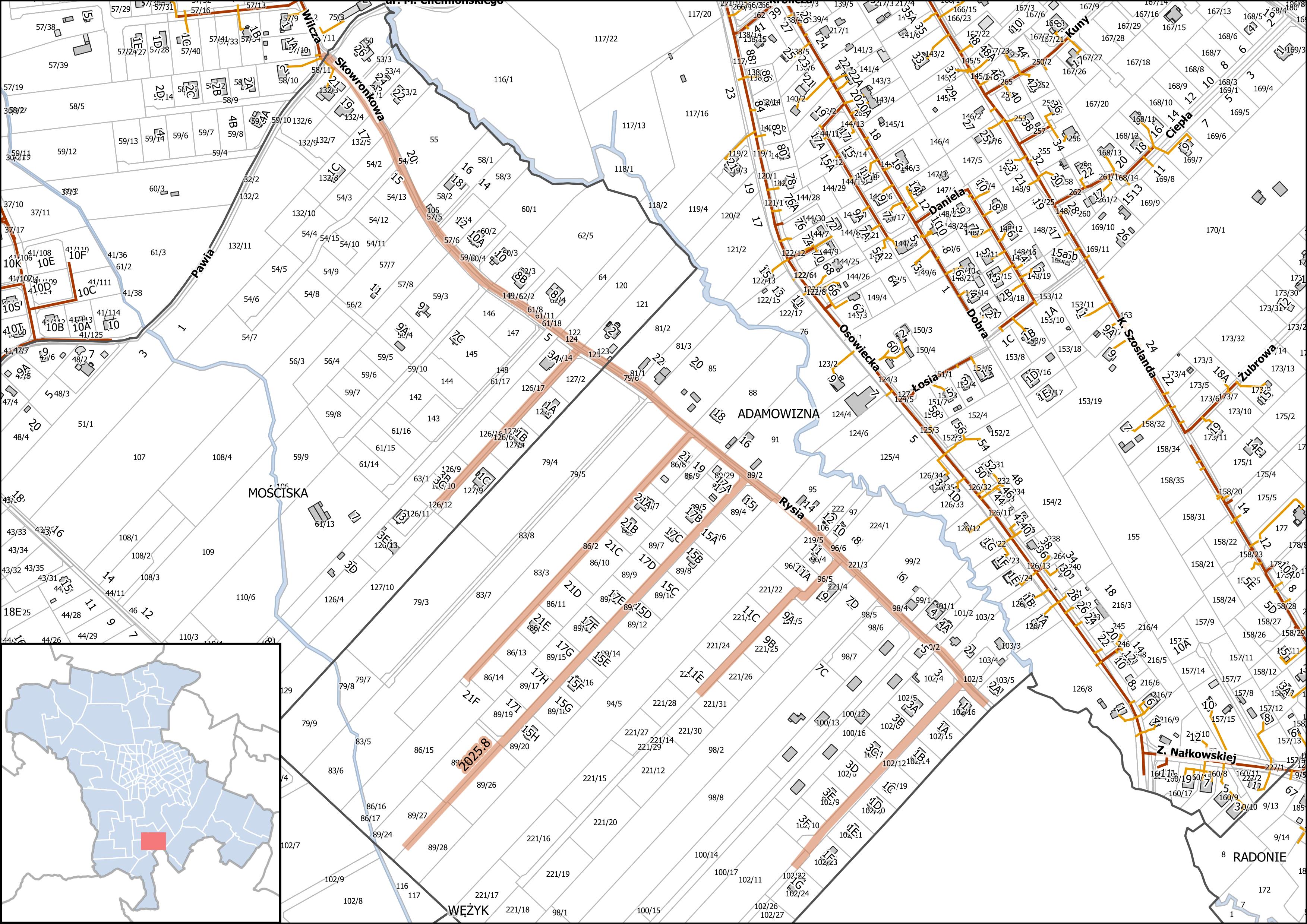 2025.8 Projektowanie i budowa sieci kanalizacji sanitarnej ciśnieniowej w ul. Skowronkowej wraz z drogą boczną (dz. 126/6) w m. Mościska oraz w ul. Rysiej wraz z drogami bocznymi (dz. 86/2, 89/22, 89/25,89/26,89/27, 96/5, 221/14, 102/12, 102/22) w m. Adamowizna - planowany termin zakończenia po 2028 r.