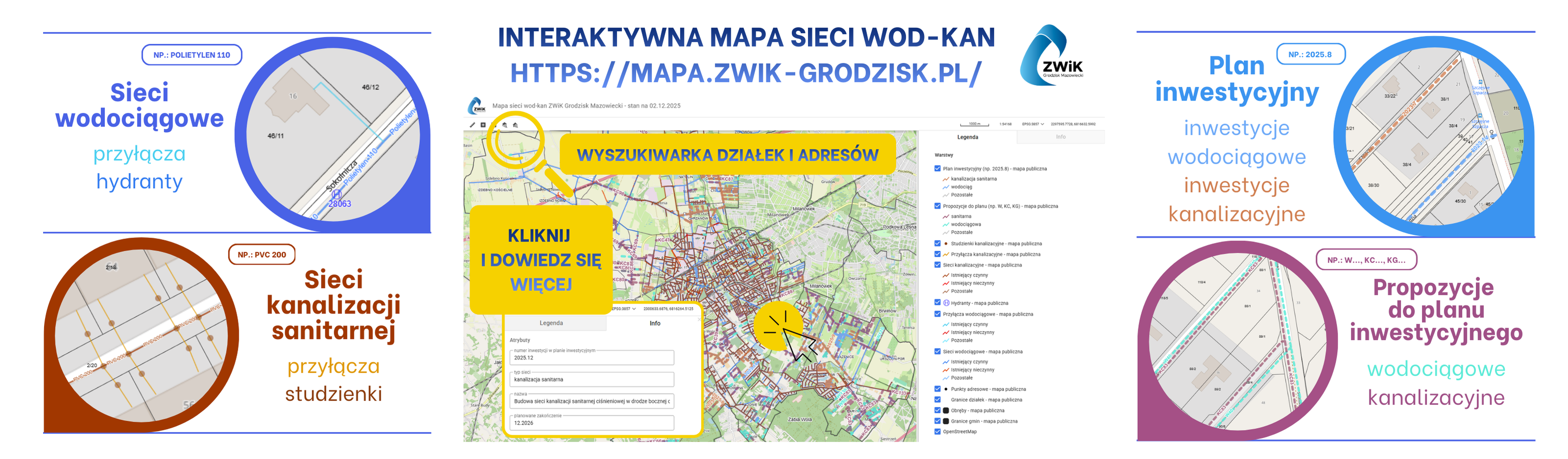 Plan inwestycyjny – warstwa obejmuje przyszłe sieci wodociągowe i kanalizacyjne, które są ujęte w „Wieloletnim planie rozwoju i modernizacji urządzeń wodociągowych i urządzeń kanalizacyjnych na lata 2025 – 2028 wraz z prognozą po roku 2028”. Są to inwestycje, dla których Zakład Wodociągów i Kanalizacji Sp. z o.o. w Grodzisku Mazowieckim podjął pozytywną decyzję o realizacji oraz zabezpieczył środki w budżecie.