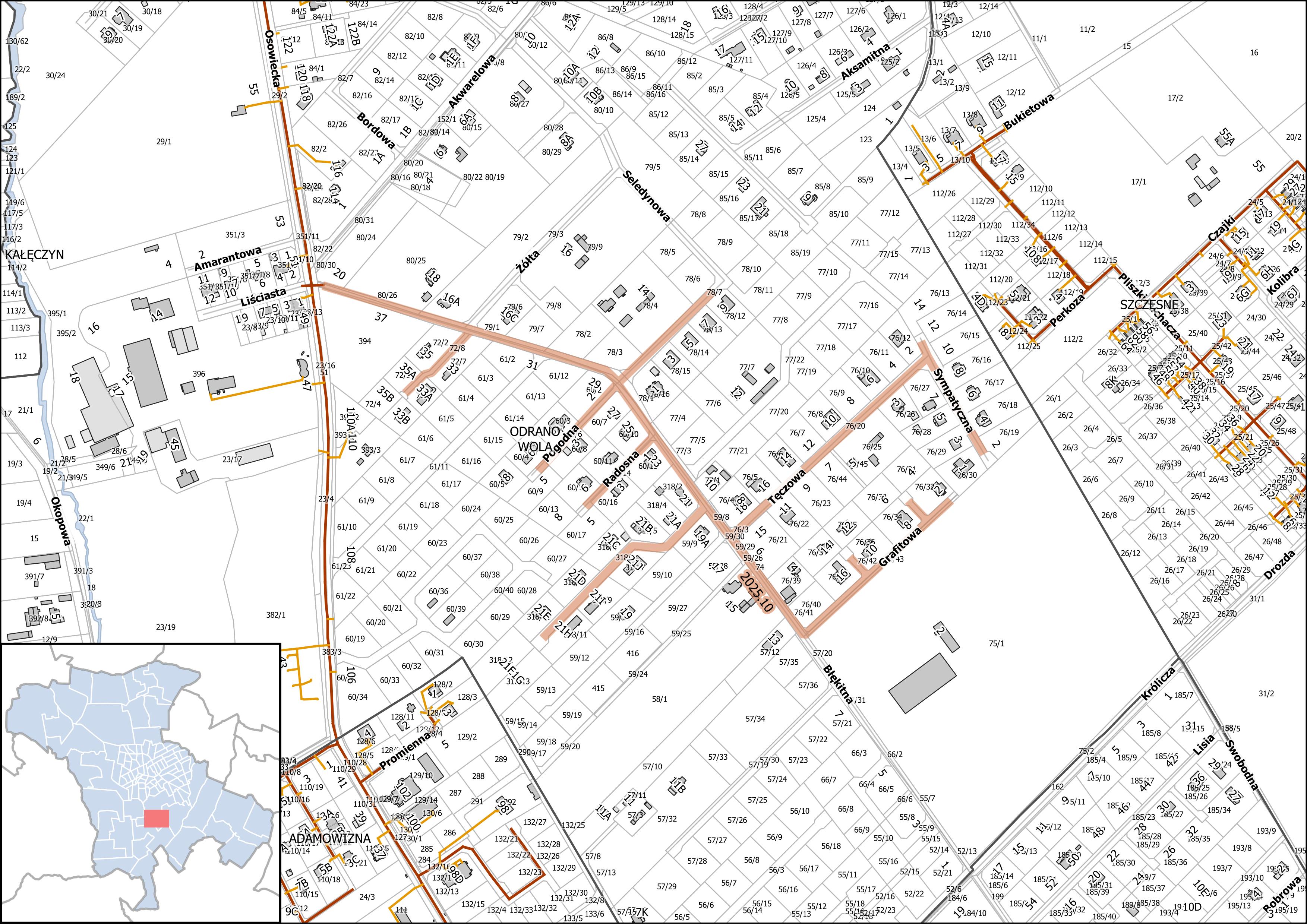 2025.10 Projektowanie i budowa sieci kanalizacji sanitarnej ciśnieniowej w ul. Grafitowej, Błękitnej, Tęczowej, Sympatycznej, Radosnej, Pogodnej, Seledynowej oraz drodze bocznej (72/8) w m. Odrano-Wola - planowany termin zakończenia po 2028 r.